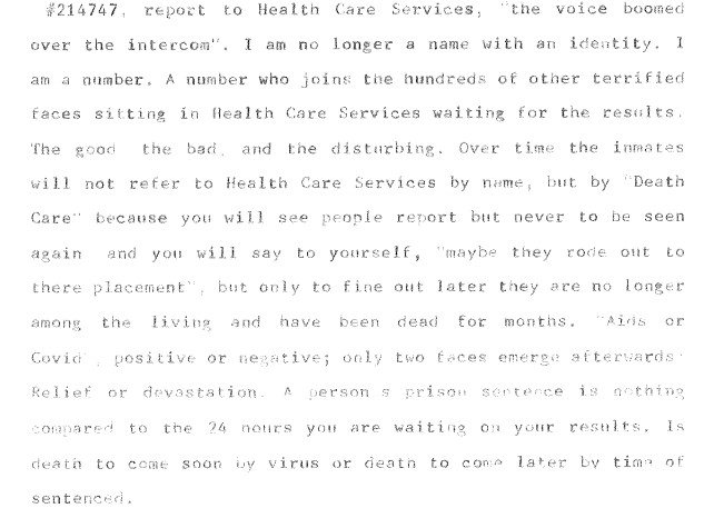 “Number 214747, report to Health Care Services,” the voice boomed over the intercom. I am no longer a name with an identity. I am a number. A number who joins the hundreds of other terrified faces sitting in Health Care Services waiting for the results. The good, the bad, and the disturbing. Over time, the inmates will not refer to Health Care Services by name, but by “Death Care” because you will see people report but never seen again and you will say to yourself, “maybe they rode out to their placement”, but only to find out later they are no longer among the living and have been dead for months. Aids or COVID, positive or negative, only two faces emerge afterwards. Relief or devastation. A person’s prison sentence is nothing compared to the 24 hours you are waiting on your results. Is death to come soon by virus death to come later by time of sentencing?