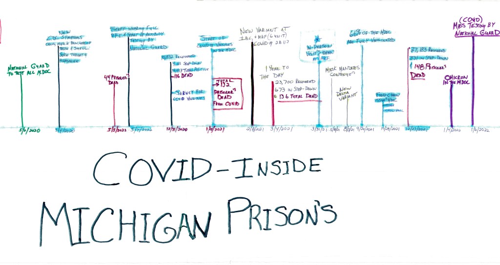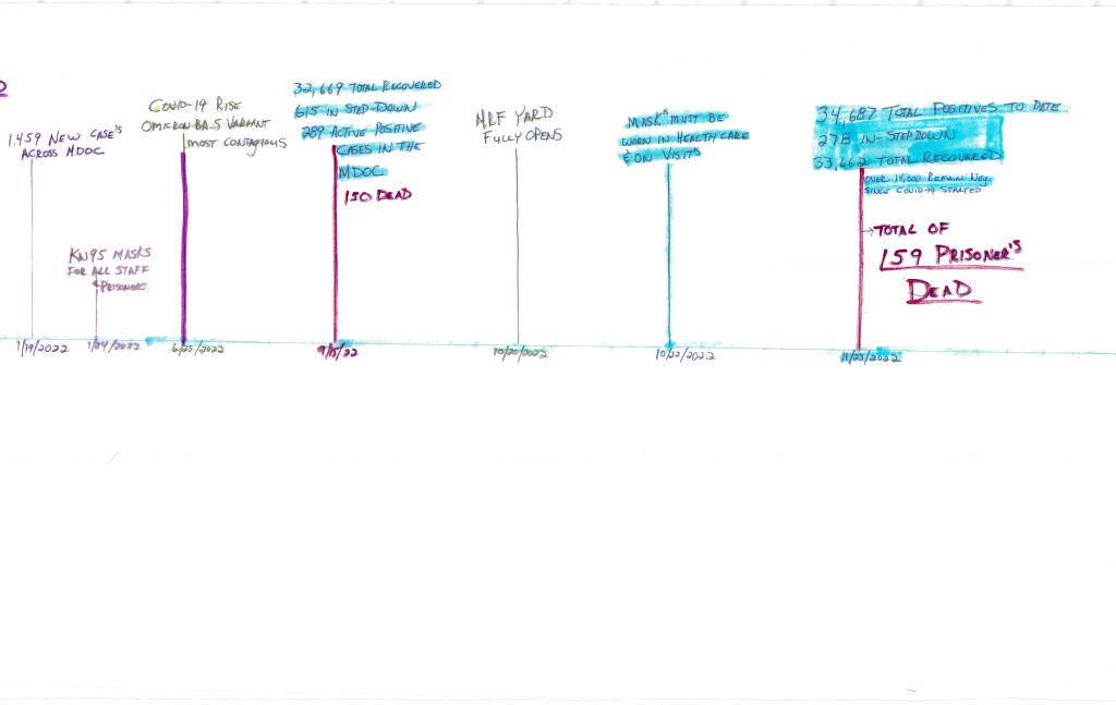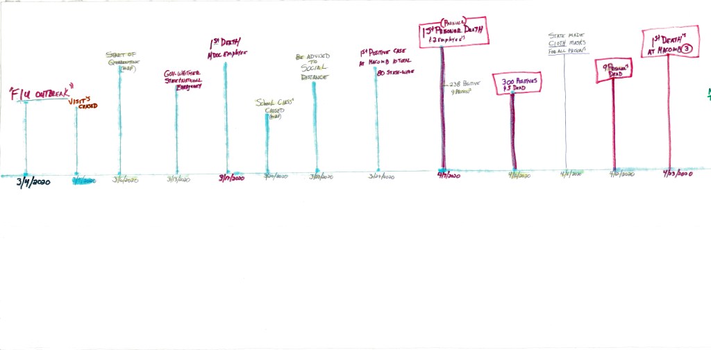 This timeline was made by an incarcerated man named Steven from within the Macomb Correctional Facility. It includes major events and death counts spanning across the years of pandemic.
